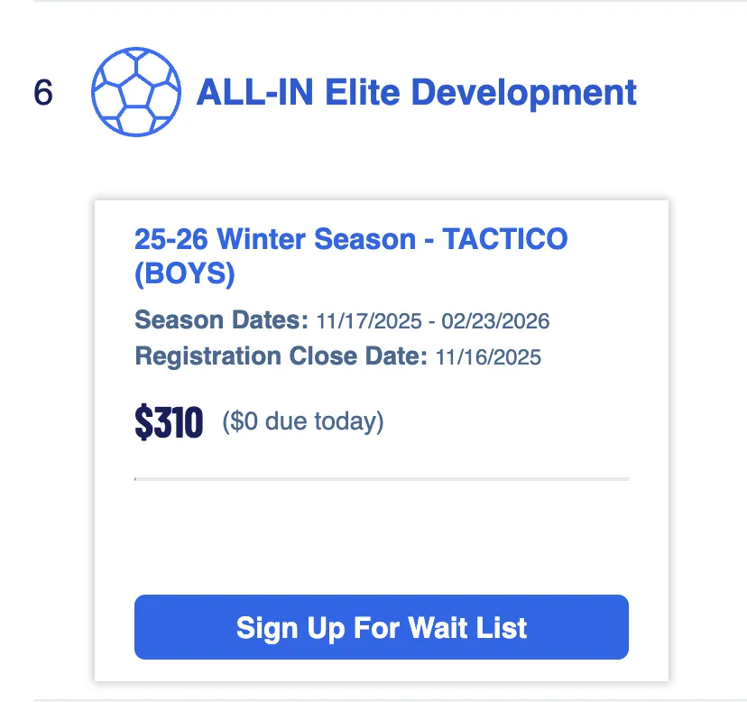 You'll see all the available programs for your player - select "ALL-IN Elite Development" and select 2025 Winter Season - TACTICO (BOYS) or (GIRLS).